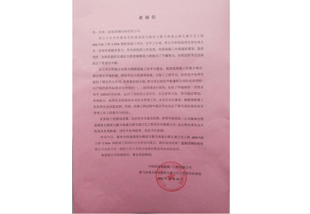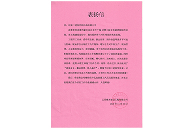 中铁四局集团第一工程有限公司向大江官方网址发来表扬信